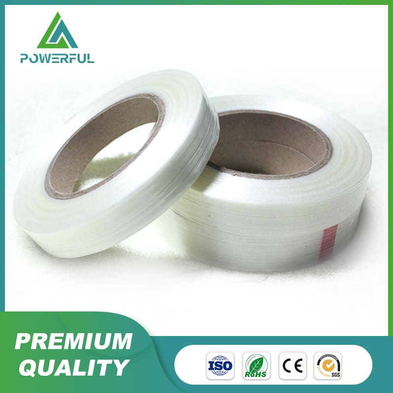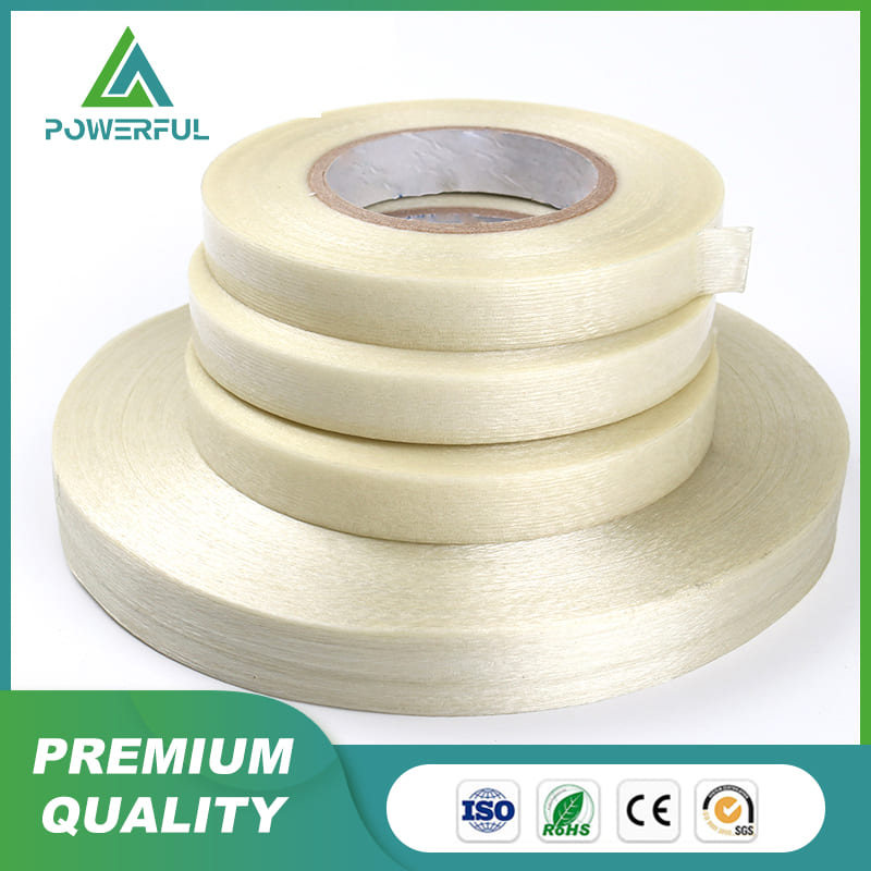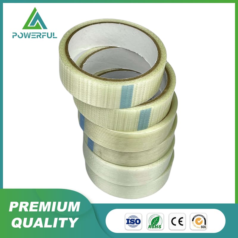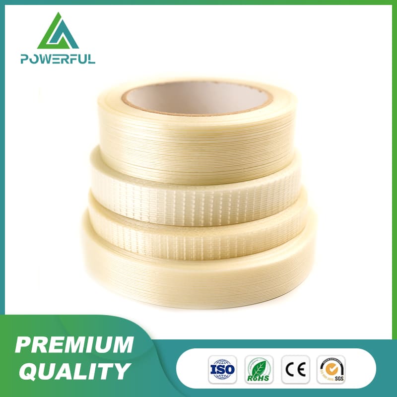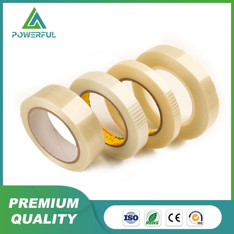 Material & Proceess: Coated with PU base adhesive, PE film is combined with fiberglass yarn or mesh and recoated with hot-melt or acrylic adhesive on fabric, and dried, rolled and cut into tapes with different sizes.